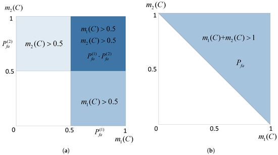 The shadow areas in Figure 3a represent the region of false alarms under the hypothesis of in the case that two detections are not fused, while in Figure 3b, the shaded region is lessened in the case that two detectors are fused together. This is the graphical interpretation of the inequality (13). Meanwhile, the dark shaded area in Figure 3a, denoted as , represents the region in which false alarms happen simultaneously in both and . Denoting the shaded area in Figure 3b as , is a subset of , i.e., . Thus, there is: