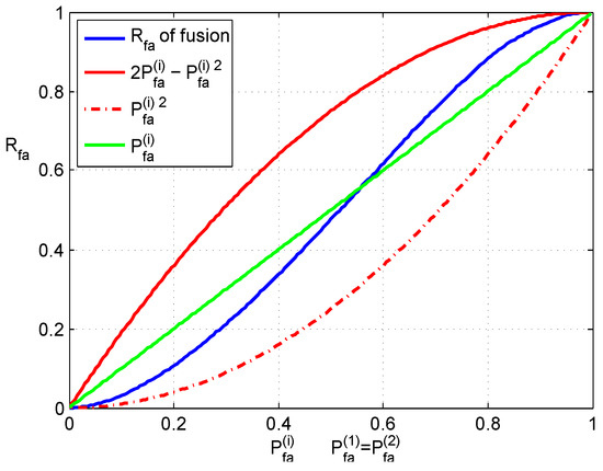 Herein, a brief derivation of is given in the case that only two detections are fused. The probabilities of under hypotheses and are denoted as and , respectively. The false alarm probability of detector is denoted as , and the corresponding missed detection probability is denoted as . In the case that only two detections are fused, is equivalent to , and is equivalent to . The derivation is provided in Appendix A. Based on Equations (4) and (5), of fused detections can be given as follows: