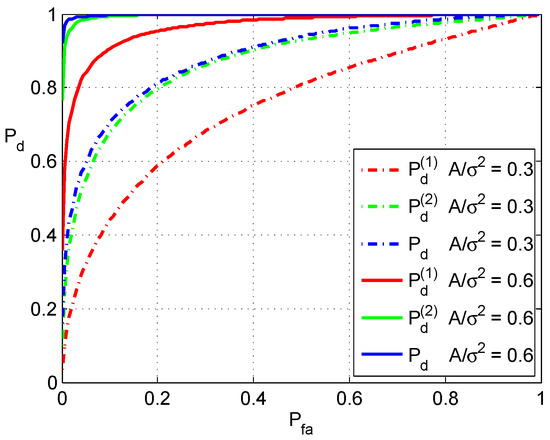 ROC curves are plotted in Figure 5. In the simulations, two different normalized biases A are tested, and the corresponding results are plotted in dashed lines and solid lines. In both cases, blue curves are higher than the corresponding red and green curves. This means that the detection performance is improved by the fusion. It should be noted that the ROC curves of fusion take account of the reduction of false alarms, which is shown in Figure 4. Simulation results with other are similar to them.