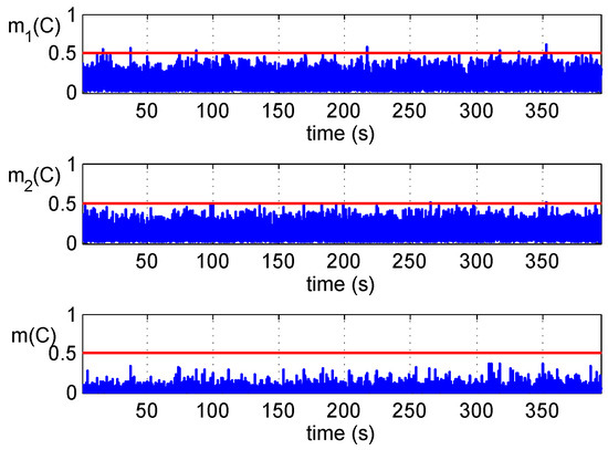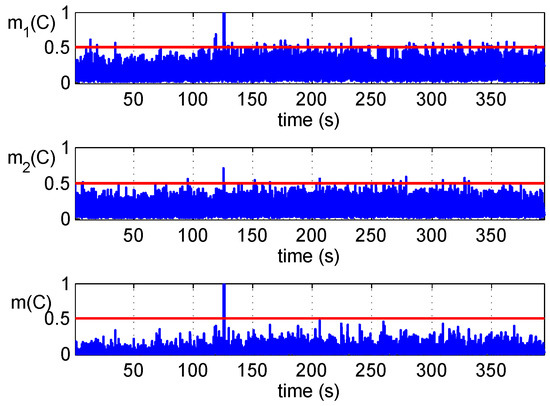 Figure 6 shows the test results of the clean static dataset where the GPS signals are not disturbed by counterfeit signals. It can be observed that there is a small number of false alarms in both two detections, and they disappear in the fused results. Reduction of false alarms is coincident with the curve in Figure 4, and it suggests that higher can be adopted to obtain a lower in each detector before the fusion.