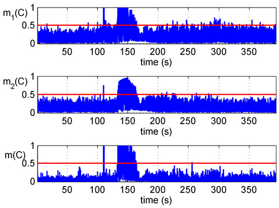 The fused results based on Scenarios 3 and 4 are shown in Figure 9 and Figure 10, respectively. In Scenario 3, the spoofer’s power advantage is weaker than the case of Scenario 2, but it still can be detected by the monitoring of correlator outputs. Besides, it can be observed in Figure 10 that the fused result exceeds the threshold at about 160 seconds, even though the second detector does not raise the alarm. This shows the robustness of the fusion method.