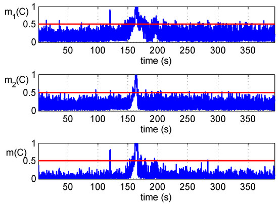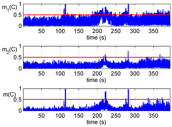 meets Equation (8), as well, and it is in a closed interval . However, descends quickly, and it makes a decision even if the anomaly is not obvious enough. The decision is strong, and it makes an irrevocable decision while all other detectors are meaningless. Figure 2 shows the curves of and , where is plotted on the horizontal axis, and the red line is the threshold to determine “A” or “C”.