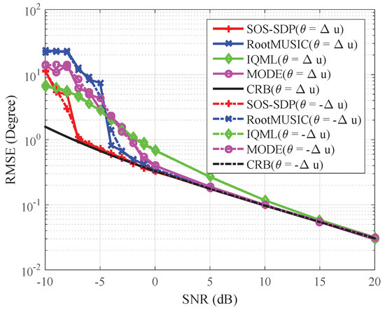 and is the estimate of in the t-th simulation. In the figure, one can easily see that the RMSEs of all the methods are decreased with the increase of SNR. When SNR dB, the RMSE of SOS-SDP coincides with the CRB. However, with the decreasing of SNR, this RMSE increases sharply. This behavior is referred to as the threshold phenomenon [1]. The threshold of the SOS-SDP algorithm is about 3 dB, 6 dB, and more than 10 dB lower than those of RootMUSIC, MODE, and IQML, respectively. According to this result, SOS-SDP can provide a better estimation accuracy at the low SNR region. The reason for this superiority might be SOS-SDP, which solves the ML problem Equation (5) directly, providing a global optimal solution not only for DOAs, but also for signals and noise variance (which are estimated implicitly). This means that all of the unknown variables in the ML problem are jointly and optimally tuned. However, MODE and RootMUSIC estimate noise variance (or noise subspace) firstly and then find optimal DOAs based on these estimates. Therefore, their DOA estimates depend on the noise variance (or noise subspace) estimations, which might be inaccurate when the SNR or the number of snapshots is limited. DOA estimates obtained via IQML are almost always inconsistent and have larger mean squared errors [10].