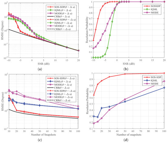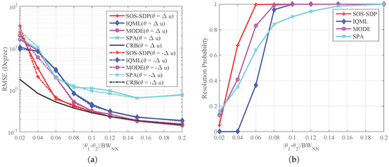 Figure 3a shows RMSE curves against . It is seen that the RMSEs of different methods are decreased with the increasing of . The corresponding resolution probabilities are shown in Figure 3b, which approach 1 as becomes larger. Based on the results of the two figures, we can see that SOS-SDP can distinguish two signal sources with probability of 1 at 0.06 , where its RMSE also approaches CRB. This bound of for MODE and IQML are 0.08 and 0.1 , respectively. It is also seen that the RMSE of SPA cannot approach the CRB even when its resolution probability approaches 1. The reason may be that SPA does not use the knowledge of M [15]. Hence, SOS-SDP has the highest spatial resolution according to the simulation results. The average running time of SOS-SDP, IQML, MODE and SPA are s, s, s, and s. The complexity of the proposed method is higher than that of others, which is a cost for the better estimation performance. We should mention that IQML and MODE are built-in functions of Matlab, while the rest are based on CVX (Version 2.0) [31], whose execution efficiency can be further improved.