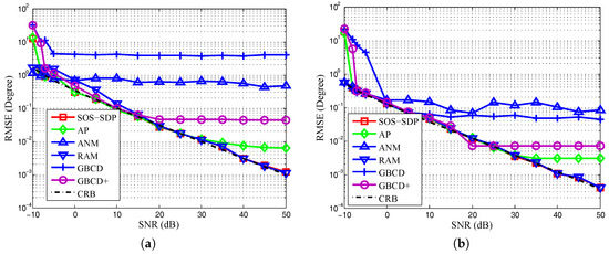 In this section, we demonstrate the performance of SOS-SDP by comparing it with some existing methods, which include RootMUSIC [1], MODE [6], IQML [10], sparse and parametric approach (SPA) [15], greedy block coordinate descent algorithm (GBCD) [17], weighted GBCD (GBCD+) [17], atomic norm minimization (ANM) [20] , reweighted atomic-norm minimization (RAM) [19], and AP based on exhaustive search (AP) [3]. Note that RootMUSIC is a subspace-based method, MODE, IQML, and SOS-SDP are based on the ML criterion, and SPA, GBCD, ANM, and RAM are sparse methods. The Matlab (2013b script, The MathWorks Inc., Natick, MA, USA) codes of SPA and ANM are both available online [28]. RootMUSIC and IQML are based on the Matlab built-in functions “rootmusic” and “phased.RootWSFEstimator” with default settings. The Cramer–Rao bound (CRB) for the DOA estimation is also given as a benchmark (see (8.102) in [1]). The parameters of SOS-SDP in Algorithm 2 are chosen as and the maximum number of iterations is . Note that is large enough for AP [3]. The parameters for Newton’s iteration in Algorithm 1 are chosen as with a maximum number of iterations of 10. The signal model is described in Equations (1) and (2), where the distance between array elements is chosen as . Complex white Gaussian noise is added to the array output with noise variance . The SNR (in dB) is defined as , where and is the expectation of a variable.