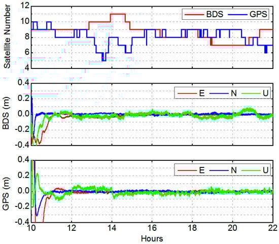 9] presented an initial assessment of the positioning performance of BDS. Using BDS observations, they showed that the accuracy of BDS kinematic relative positioning was comparable to that of GPS kinematic positioning, exhibiting a root mean square (RMS) of 3, 3, and 6 mm in the east, north, and vertical components, respectively.