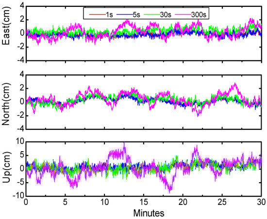 Figure 7 is one segment of the error performances of BDS PPP in the east, north, and vertical components with clock intervals of 1 s, 5 s, 30 s, and 300 s respectively. From the mean values of