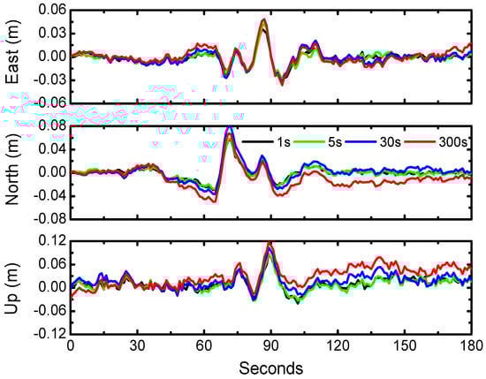 In addition, we retrieved the displacements waveforms with BDS PPP (during the earthquake) using different clock products at intervals of 1 s, 5 s, 30 s, and 300 s (