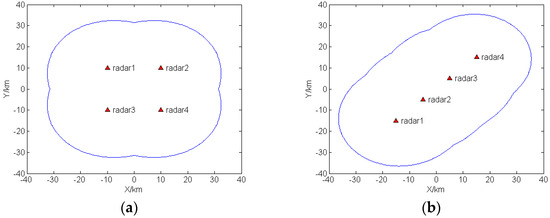 In order to evaluate the sensitivity properties of radar network, the SNR threshold has been set as 13 dB. The two-dimensional coverage plot of the first case is shown in Figure 1a, and the coverage plot of the second case is shown in Figure 1b. Targets located outside the boundary cannot be detected.