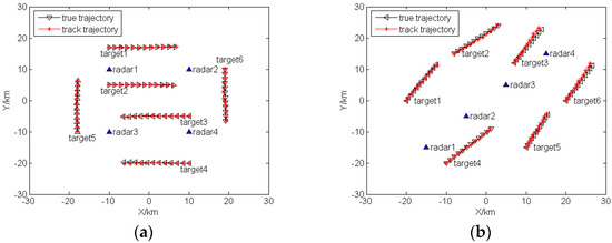 True target trajectories and track trajectories: (a) Case 1; (b) Case 2.