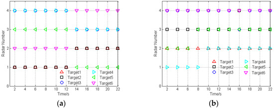 To obtain the minimum transmitted power matrix shown in Table 1, a 24-time bisection method is employed to solve Equation (19) at each sampling instant for each case. Then, the sensor selection algorithm with lower complexity proposed in Section 4.2 will be applied to solve Equation (20) at each sampling instant with the minimum transmitted power results. It can be assumed that the traceability of each radar in the radar network at each time instant is . Additionally, the sensor selection results of case 1 and case 2 are displayed in Figure 3.