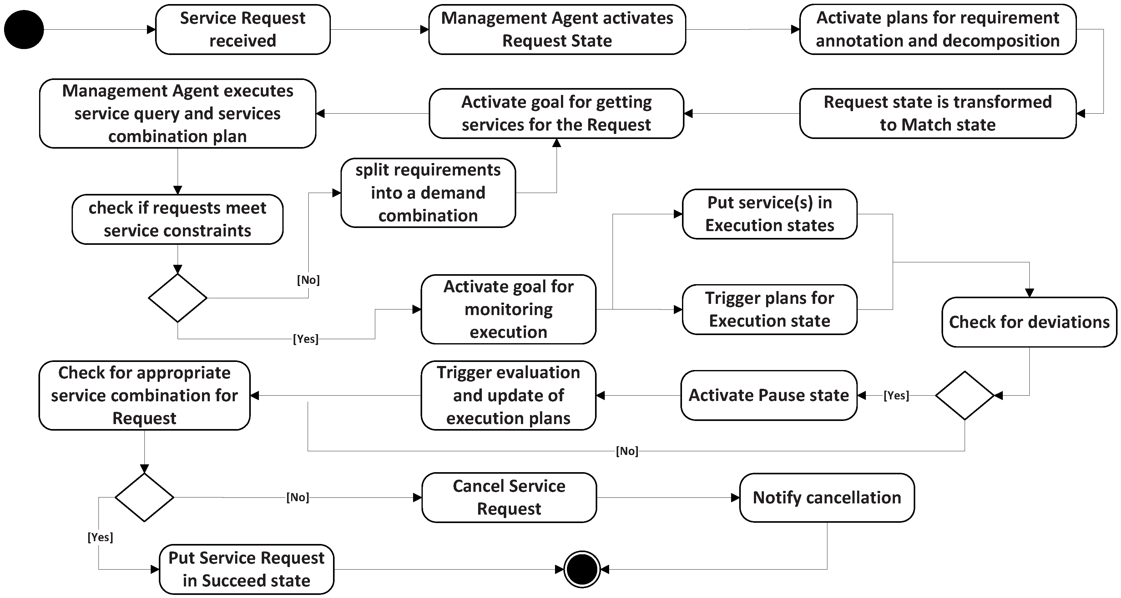 Table 2. When a service request is received, the MA activates one or several sub-goals and triggers the execution of the plan to find services to meet the demand. These plans model how the MA behaves for each situation. For instance, when a new service execution is in the request state, MA activates the goal for getting services for the request and executes the plans’ Constraints (Cons.) annotation of the service Requirement (Req.) and its decomposition. An appropriate decomposition changes the service state to match. In match, the MA first executes the query plan. If it cannot return the satisfied constraint services, the requirement will be split into a demand combination. In execution, the MA activates its sub-goal to monitor the service scheduling of the managed SAs. It triggers two corresponding plans: scheduling and Evaluate (Eval.) matching. Scheduling is searching the candidate services in the local and the MA’s neighbors. Eval. matching is evaluating whether the requirement is fulfilled. If all of the constraints have been satisfied, MA will change the state to succeed. If any deviation exists, MA activates the pause status, which triggers the evaluation and updates the plans, until it returns an appropriate service combination (status succeed) or a failure. A service request reaches a cancel status when the service fails to meet the requirement. In this case, the MA falls to recover from the status of execution, and this will be notified as cancel. The execution states diagram is shown in