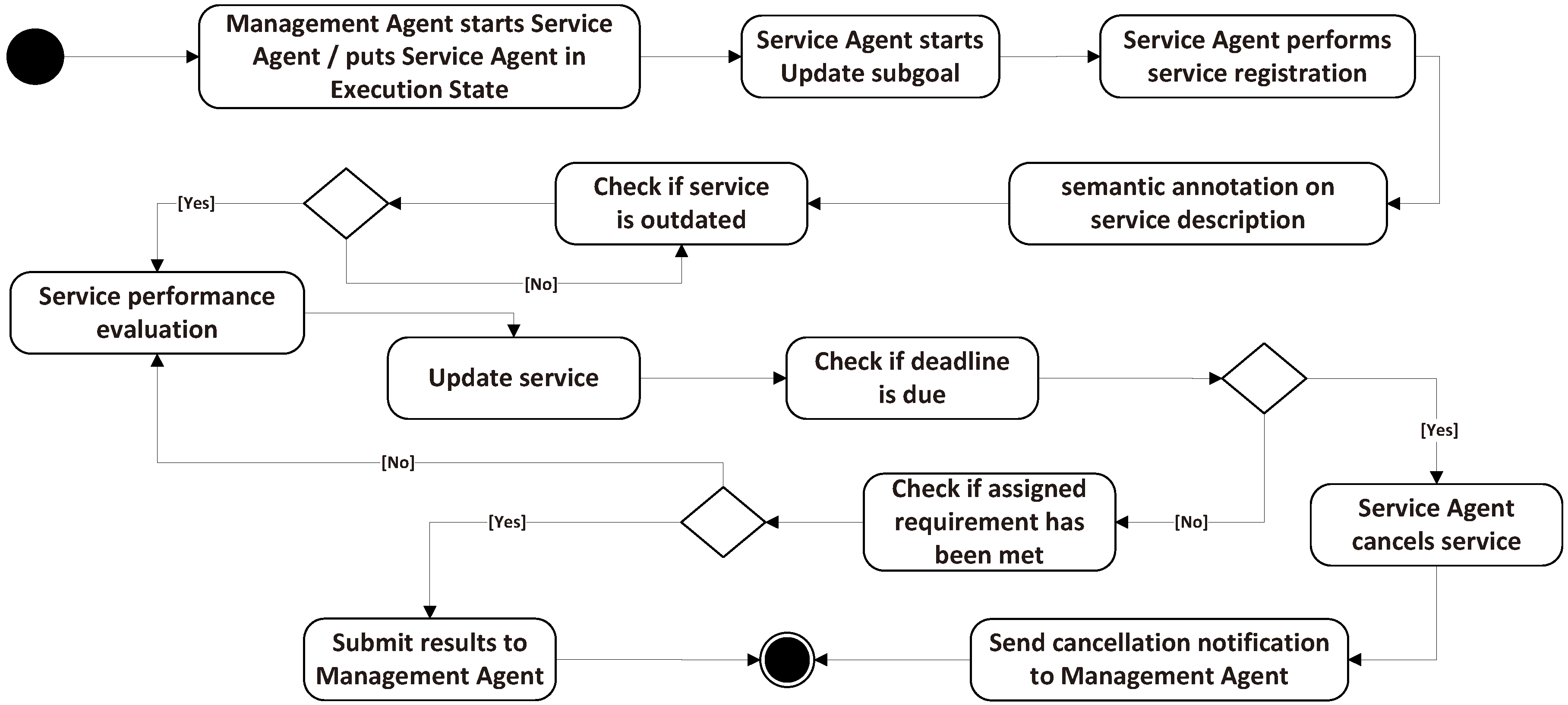 SA has three states: maintain, pause and cancel; and three corresponding sub-goals. Every time a sub-goal is activated, the upper MA will execute a sub-goal to monitor the scheduling of this SA, as defined in the execution state. In the sub-goal of update, SA achieves its local service registration, semantic annotations and updates of its proxy entity periodically. When a service request arrives, MA executes scheduling based on the existing service registration. The sub-goal recover pause is executed for the performance evaluation (Eval.) calculation based on the outdated check. If the service is outdated, SA evaluates the service to decide whether to update or renew the service. The execution states diagram is shown in