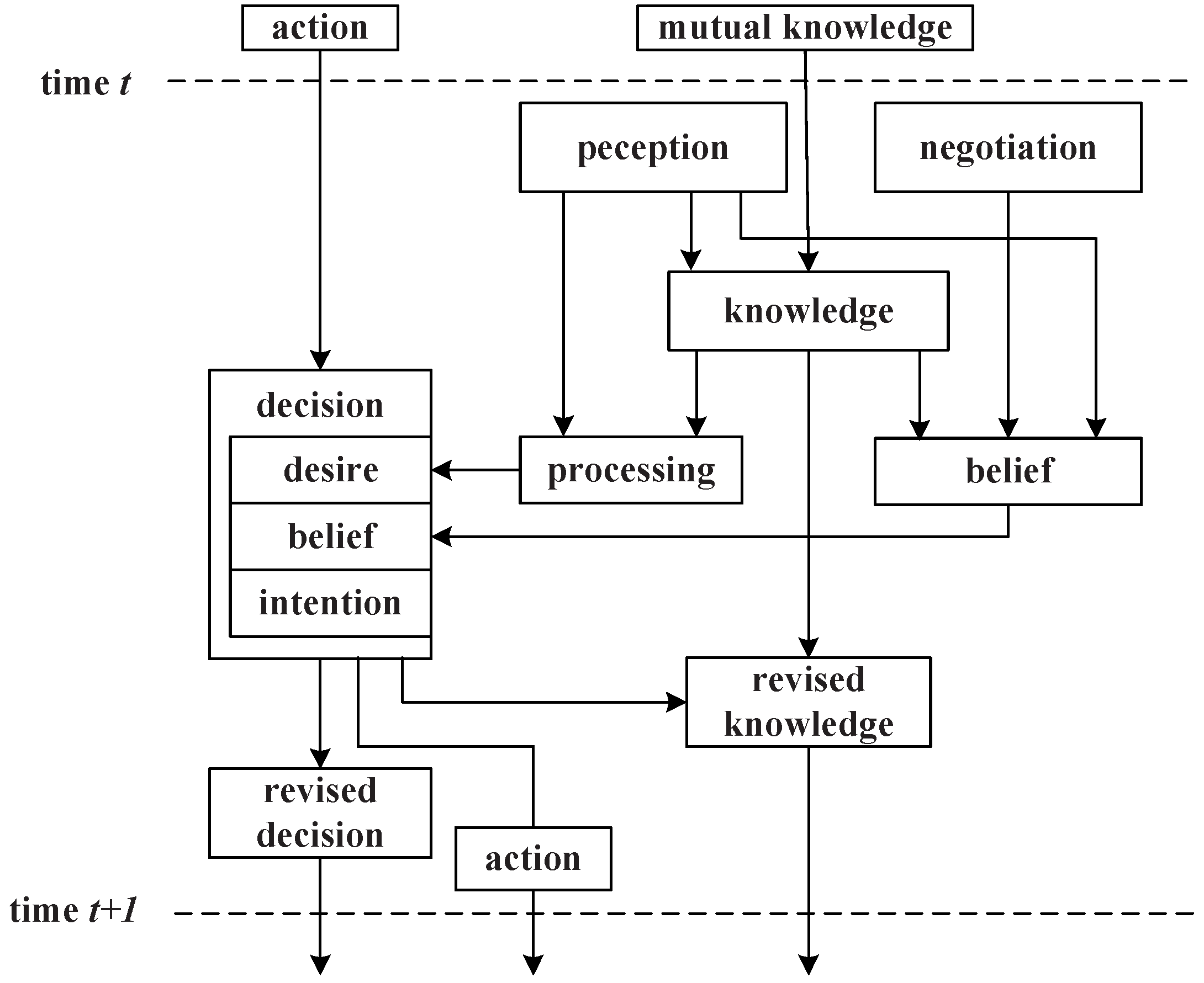 Intentions: The agent’s intention can be denoted as an action function of , which means the action i is based on its perception and belief; is regarded as an optimum action.