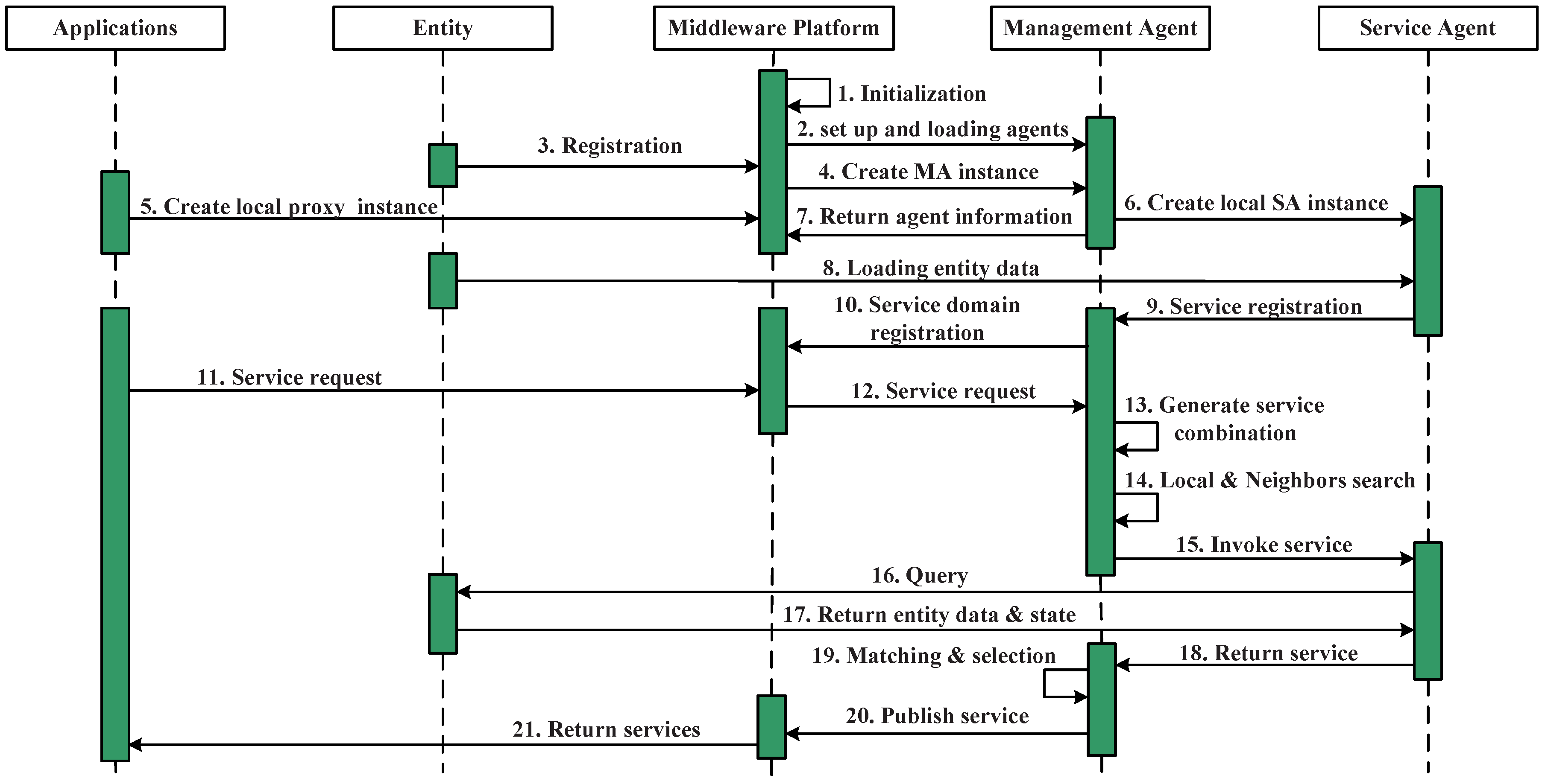 Figure 5 shows the workflow during the service scheduling process. Steps 1–9 achieved the agents instantiation and service registration procedures.