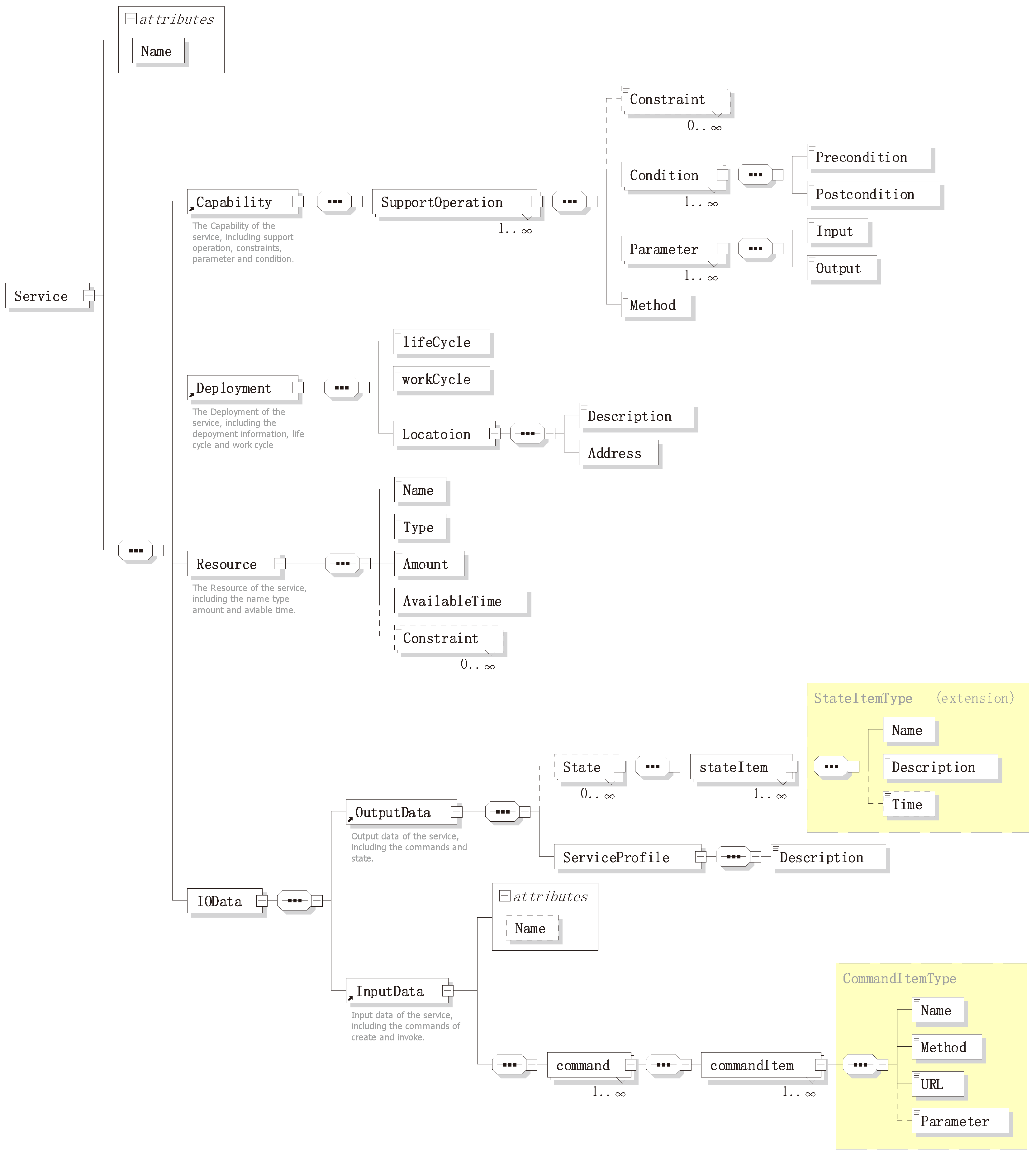 The InputData property describes the commands that shows how to invoke the service. The OutputData property describes the semantic information of the service, which includes the service state information (it is dynamically changed) and the service profile. In the service profile, it described the service basic information and the encapsulation of underlying data, which need to be understood and parsed by the scheduler. According to the IOData property, the SA can get all-around information about the service and the transmitting data for its proxy entity. All information will be used to build the service and provide semantic information to support semantic service enablement. Consequently, two complex data types were defined in the IOData property,