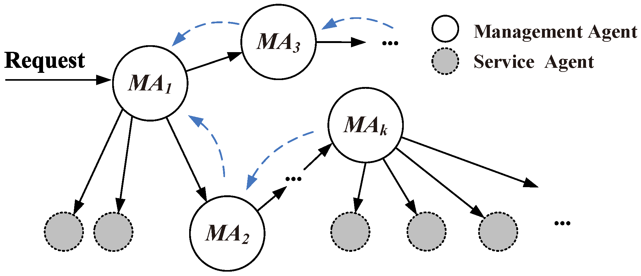 MA can only manage its local services and store it neighbors’ services, but cross domain service scheduling needs to query the other MAs. The query is based on its observation of other MAs, so it can be a directional query rather than broadcast queries. In addition, as the system expands, each MA may only know its neighbors’ services rather than the whole system (global synchronization states in a large-scale system; the cost is too high and unnecessary). Furthermore, each service within the system is constantly changing (affected by its entity state), and the update is not reported to each neighbor synchronized; it is often based on the query. Therefore, establishing a decision model to support cross domain service scheduling is needed; the details are in
