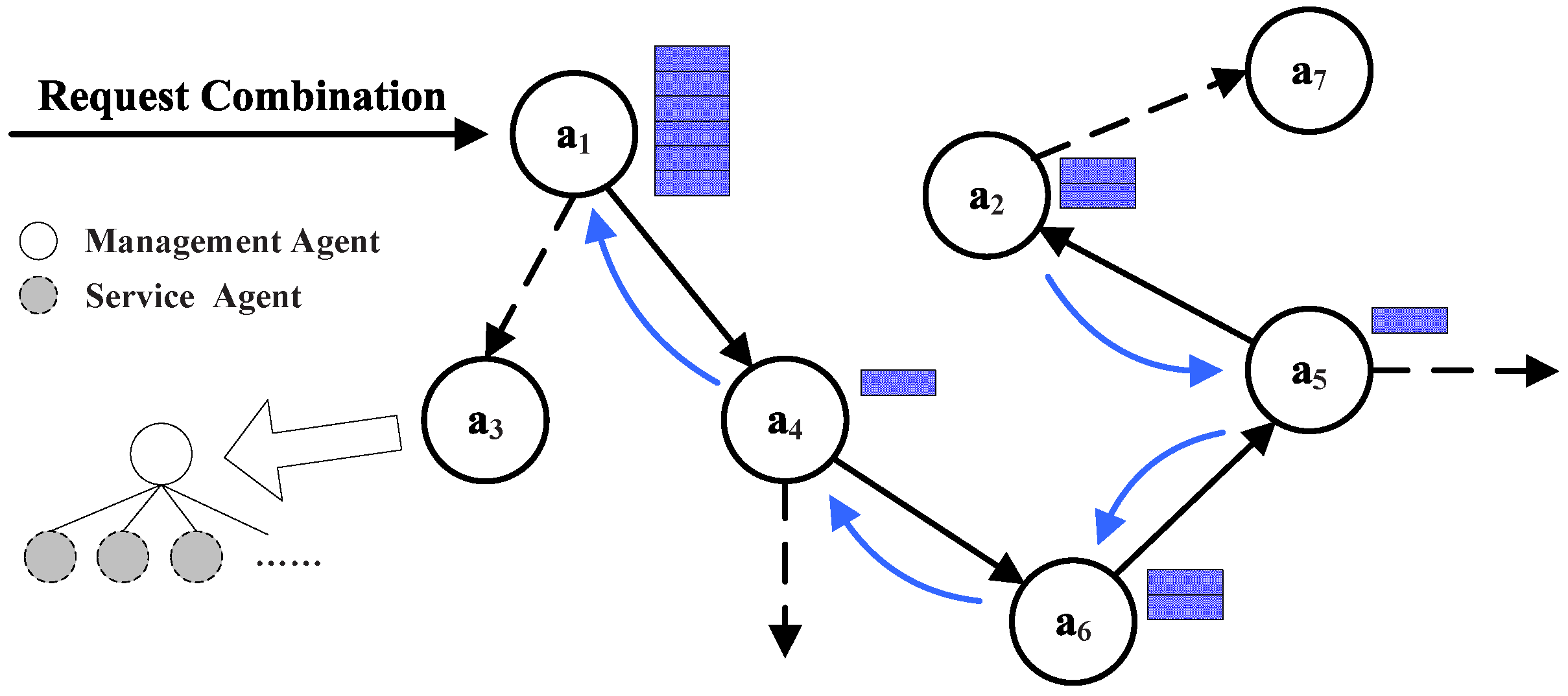 When receiving a request, the management agent first checks its local records. If there are any, return the services and renew the combination activity ID, the prior agent and the computing assessment of these services. After the current request is completed, the agent continues executing the next request and works as above, and them modifies the prior agent in the table as the current one. The system performs this loop until there is no relevant item in the table or timeout.