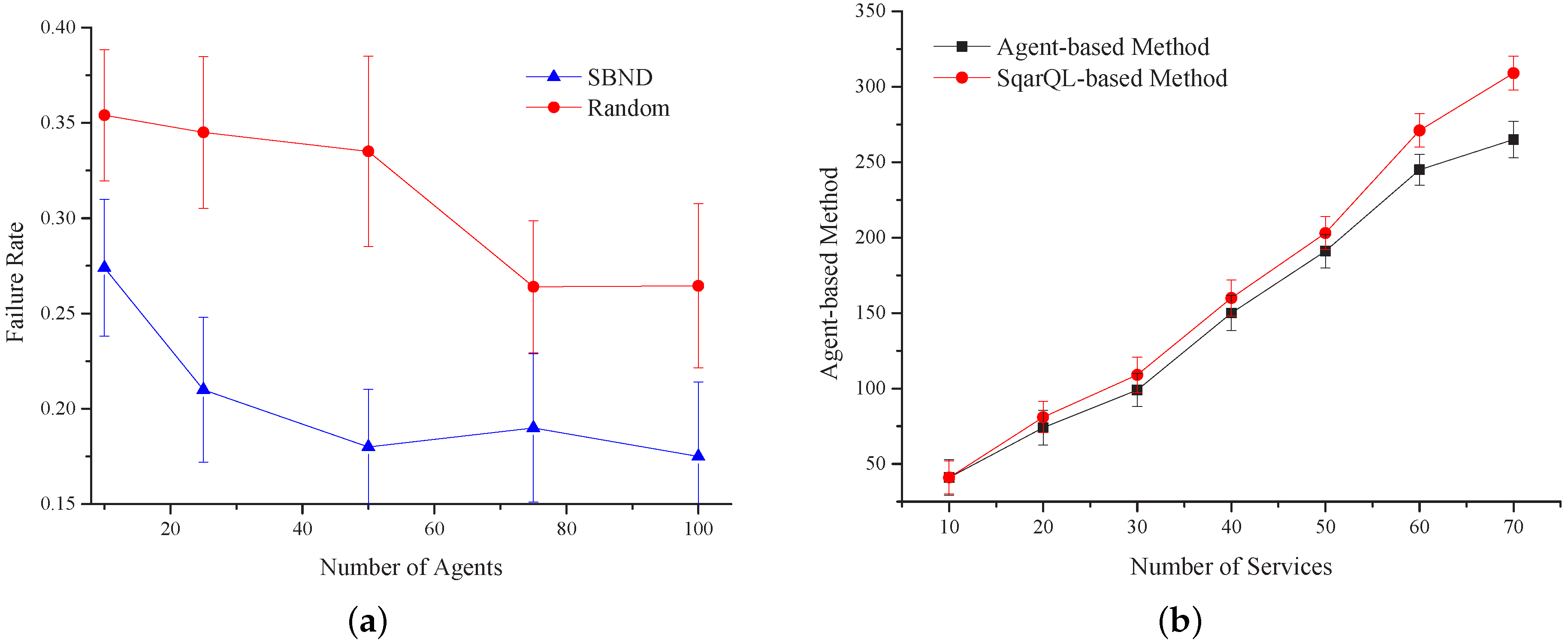 Figure 19a shows the comparison of the failure rate under two different service transmission mechanisms based on the designed middleware system. The figure illustrates the failure probability of the requirement when executing the combined tasks. We compared our algorithm with the random algorithm. This figure shows that the convergence rate of our algorithm is faster than the random algorithm. When the number of agents is 40, the failure rate of our algorithm decreases quickly, and then, it maintains a constant value at 0.18. However, in the random algorithm, the failure rate will be stable after the agent number reaches 60, and the failure rate will keep at about 0.23. From the above analysis, the convergence rate of our algorithm is faster, while its failure rate is 0.05 less than the failure rate in the random algorithm.