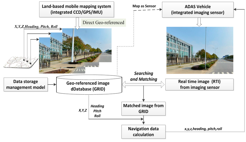 Nonetheless, cases of absolute navigation with global 3D coordinates and orientation have been observed, such as outdoor navigation, the L-MMS for 3D surveying platforms, and space navigation [2,13,14]. These cases require global geo-referencing with highly accurate absolute 3D coordinates and may include GPS/IMU; however, harsh and poor environmental conditions limit the performance of GPS/IMU navigation. Thus, map-based vision navigation is implemented by providing a moving platform with a geo-referenced 3D model of the environment, such as a 3D map, landmark, and geo-referenced image database (GRID) [3,15,16]. Map-based vision navigation considers the map as a sensor to match the real-time imaging sensor and facilitate highly accurate absolute navigation in advanced driver assistance systems (ADAS). A collection of geo-referenced images serves as a map for real-time localization; this collection is normally treated as a 3D map because it contains not only a set of landmarks but also the corresponding 3D location information [17,18]. Thus, imaging sensor-based vision navigation has two application scenarios as a map-based navigation approach: one is to improve the reliability of navigation under harsh environmental conditions in which GPS and IMU are ineffective, such as in ADAS. The other is to improve navigation accuracy where the vision navigation result is considered to be new input for Kalman filtering with GPS/IMU, such as in L-MMS.