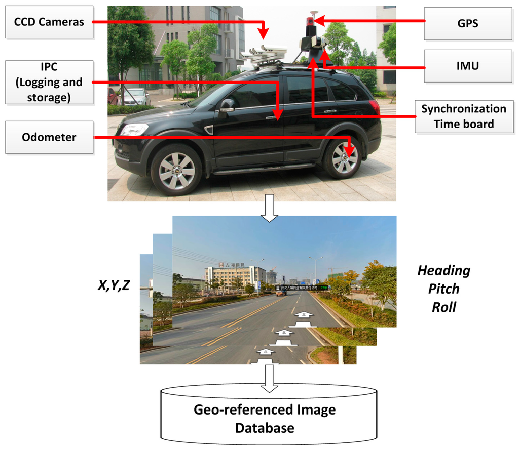 The GRID is compiled by multiple sensor-integrated, land-based mobile mapping systems, which were developed in the 1990s for rapid and efficient road surveying. Such systems include VISATTM, GPS VisionTM, GI-EYETM, LD2000TM, ON-SIGHTTM, Topcon IP S2, and Hi-Target iScan [2,23,24,25]. L-MMS integrates geodetic quality GPS, an inertial navigation system (INS), an odometer, a synchronization time board, and digital cameras that are mounted on a land vehicle (as presented in Figure 2). As a result, highly accurate GPS data can be logged along with INS orientation data and sequence images with high synchronized time in the process of running along defined routes at a speed of no more than 80 km/h.