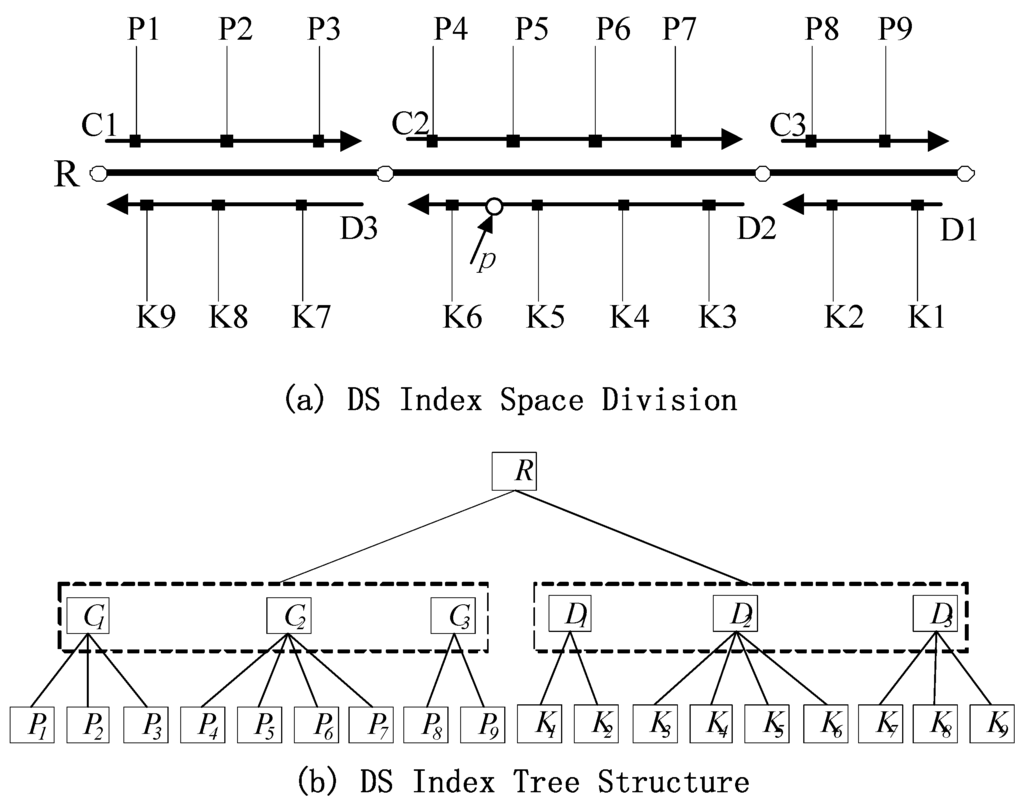 The shape of the DS tree is similar to those of the R tree and quad-tree. However, the latter two indices are located in a 2D space, whereas the DS tree is indexed in a 1D linear space. In addition, the quad-tree and R tree represent the position of an object in an index space given the spatial coordinates of object (X, Y) or a minimum bounding rectangle, whereas the DS tree indicates the position of an object through offset M of the object. This tree is composed of root, intermediate, and leaf nodes. The 1D data set is divided recursively according to the nodes in each layer. In Figure 3, the two-direction road R includes two road-width-flow centerlines C and D that correspond to two road section sequences in opposite directions: C1, C2, C3 and D1, D2, D3, respectively. These sequences comprise image sequences P1, P2, …, P9 and K1, K2, …, K9. Figure 3a presents a schematic of the division of road R via DS index intervals. Figure 3b illustrates the corresponding DS index tree structure, where R is the root node. The structure of R can be expressed as R(RID, M1, M2). RID is the logical road index number. M1 and M2 are the beginning and ending offsets of the entire road. The starting offset of the road (M1) is generally set to 0. Intermediate node C or D includes section sequences along two directions of the centerline of road way flow, and the related structure can be expressed as S(SID, M1, M2). SID is the section index number, and M1 and M2 are the beginning and ending offsets of the sections along road flow, respectively. The leaf node stores information on each image in the GRID image sequence, and its structure is I (IID, M). IID is the image index number, and M is the offset of the sections in which the image position is detected.