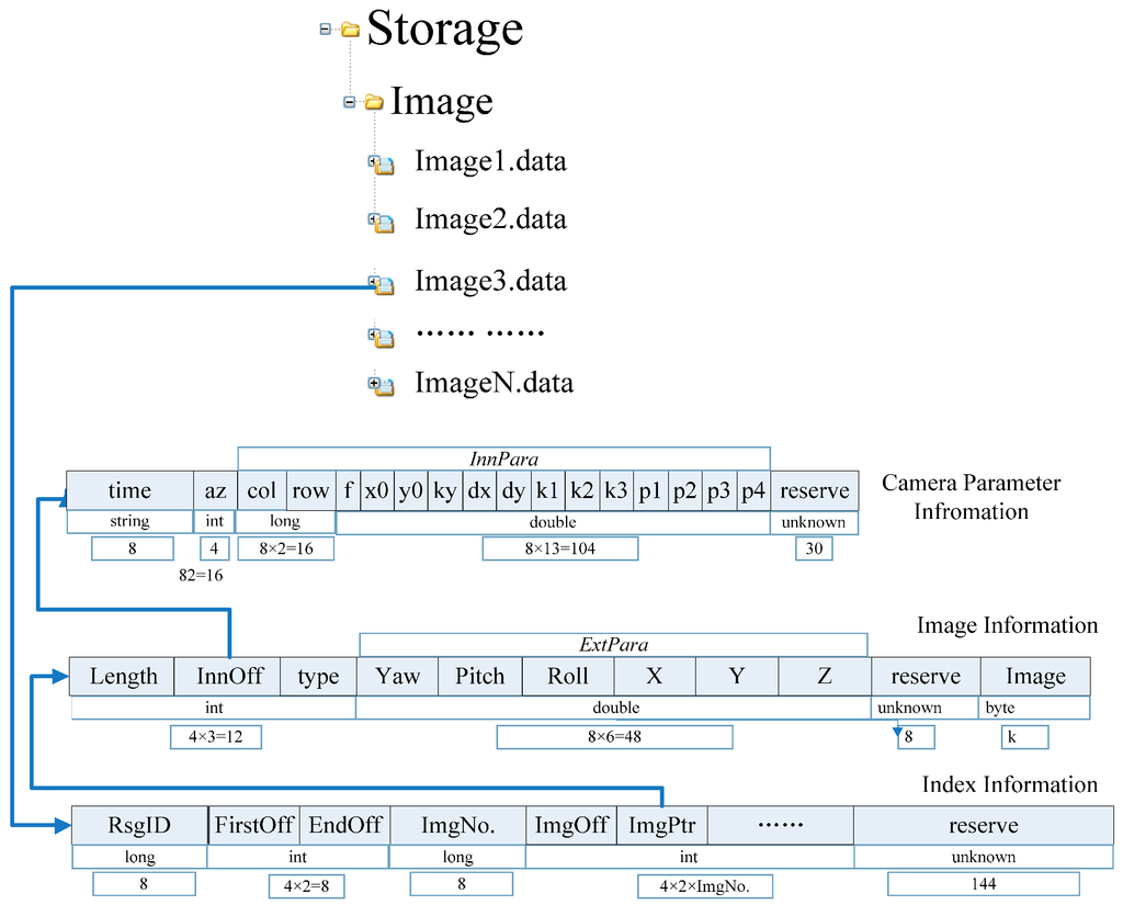 A large file for GRID can be divided into three parts: an image index table, a file body, and an image parameter file. The index table records the current file section ID (long type, eight bytes), first section offset of the image position in the file (int type, four bytes), final section offset of the image position (int type, four bytes), number of images (long type, eight bytes), section offset of each next image in turn (int type, four bytes), and stored address of the image in the file (int type, four bytes). The file body accounts for each image information record (44 bytes plus the space occupied by the image sequence). The image parameter file stores the interior and exterior orientations of the GRID. The size of each large file for this database should be controlled to below 200 MB for one road section. When the file size exceeds this recommendation, a new large file should be generated automatically. One record should not be stored in two separate files. If the current storage space is not enough to store an entire piece of data, then this information should be transferred to a new large file for storage. All large GRID files are labeled “Image” + n + “. data”.
