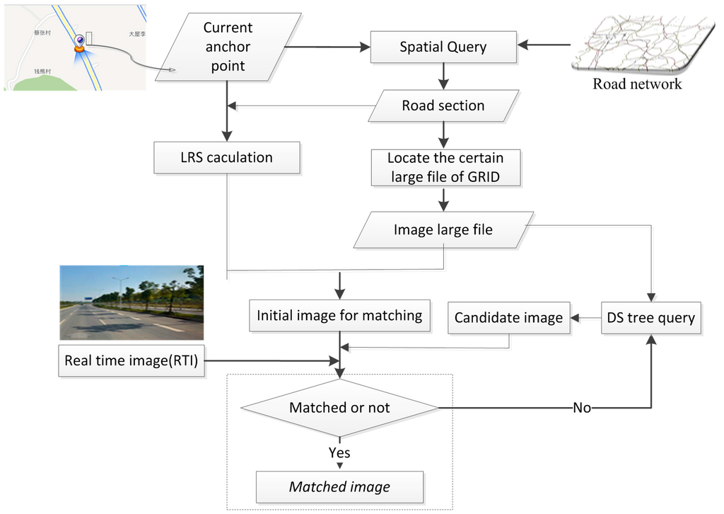 The current anchor point from GPS/IMU is considered as the spatial query input within the road network to determine the current road section. A large file can be located through the road section based on the proposed GRID data model. Meanwhile, the anchor point is converted into a 1D coordinate based on the LRS model to obtain the initial image from a large file as the candidate image for matching with the RTI. The candidate image is identified based on the DS tree; the process stops until the image is well matched with the RTI, as explained in the subsequent part.