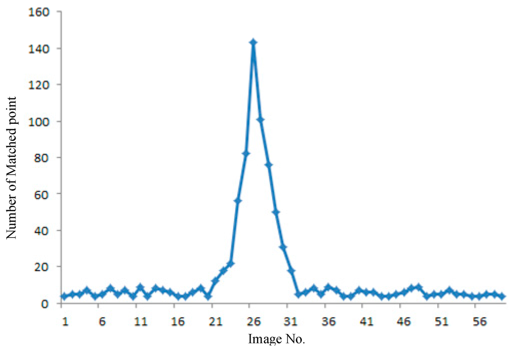 The image searching and matching processes intersect, as depicted in Figure 5. We can determine the match status according to the number of the matched key points between RTI and GRID. The number of matched points can be used to guide the search direction based on the LRS in a large file. Figure 6 presents an example of the number variance of the matched points. A total of 59 images from GRID are considered candidate images to match RTI.