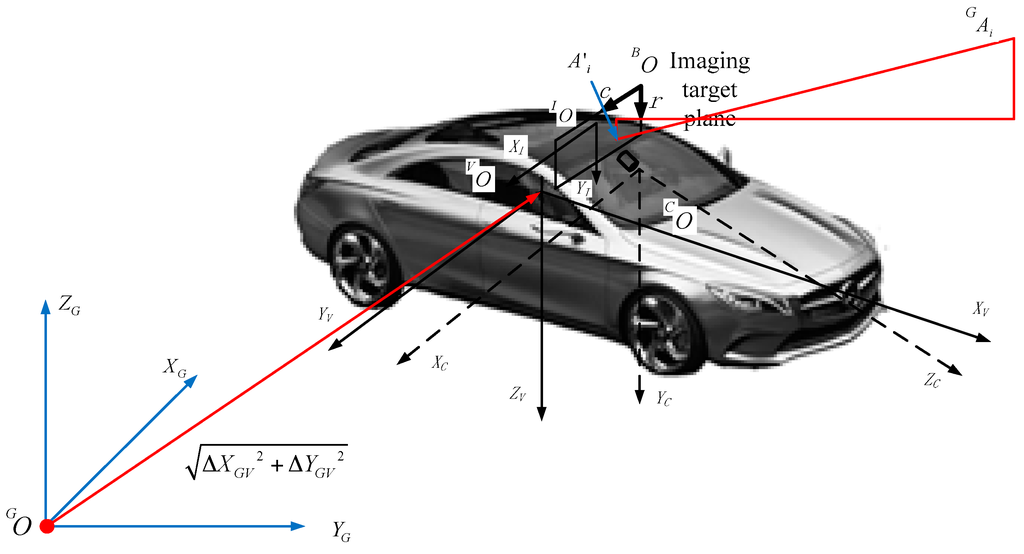In the proposed imaging sensor-aided vision navigation system, a camera is fixed to the body of a moving vehicle, as described by a right-handed coordinate system. We define five coordinate systems to derive the navigation parameters from GRID to RTI, as shown in Figure 7.