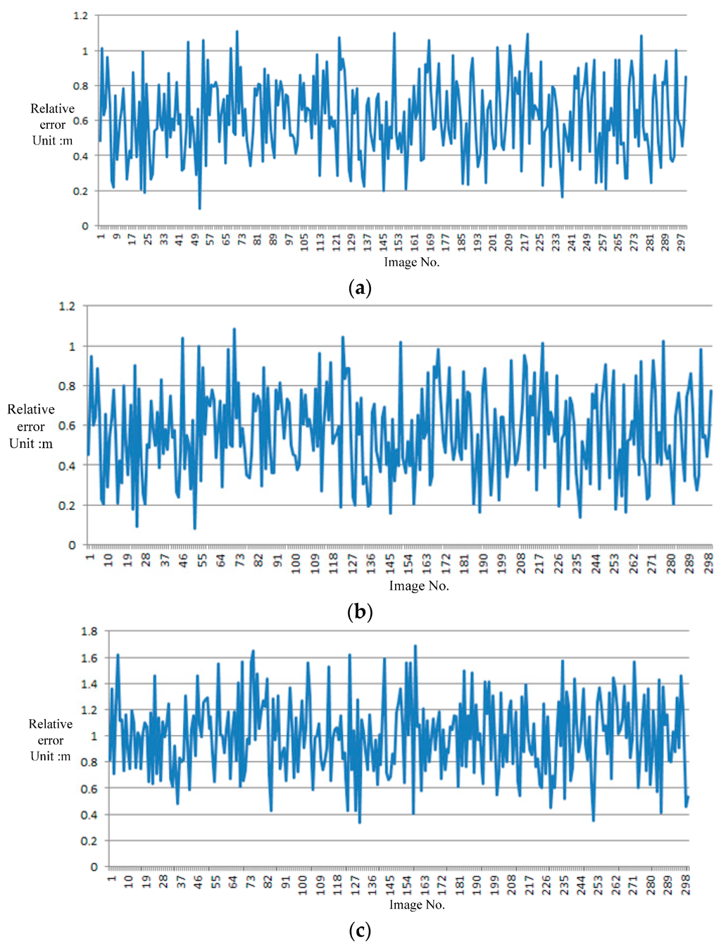 To assess the accuracy of the proposed vision navigation method, we use L-MMS to collect data on a single block twice at different times. One dataset is utilized to build the GRID as the proposed approach. Another dataset is employed to simulate RTI. A total of 300 images are regarded as RTIs for searching and matching with GRID. The image interval distance is set as 5 m, and the total time for 300 images is approximately 300 s within a distance of 1500 m. Then, the navigation parameters of the moving platform are calculated from the 300 images with the use of the proposed approach. The navigation results are compared with the tightly coupled integration of GPS/IMU via Inertial Explorer® software. Figure 8 presents the absolute value of the relative error in x, y, and H.