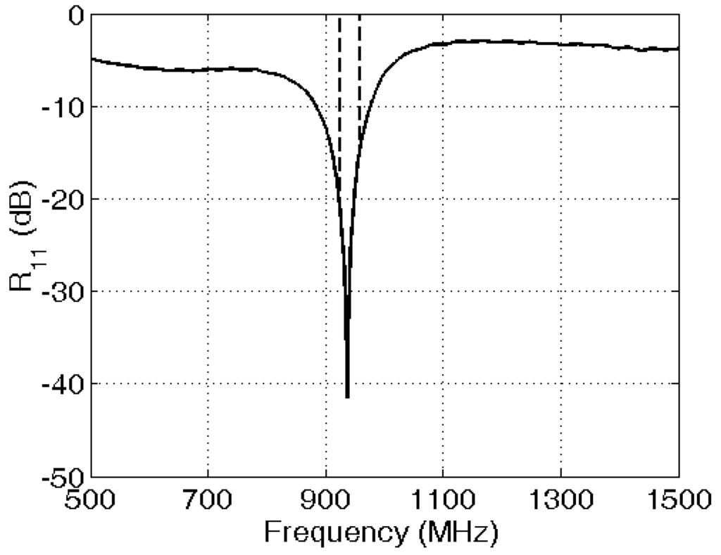 Measured power reflection coefficient (R11) of the textiles antennas used for the GSM 900 DL band (the band is indicated by dashed lines).
