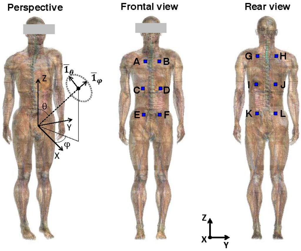 The 12 points on the torso are chosen so that they are distributed equidistantly over the full height of the VFM’s torso (from 0.9 m to 1.6 m) and are located at −150° and 150° at the back and, −35°, and 35° (positions C and D) or −45° and 45° (positions A, B, E, and F) at the front of the torso, using the spherical coordinates shown in Figure 3. The textile antennas are placed on the body so that their rear plane does not intersect the phantom (this requires small shifts ≤ 2 cm in the +X or −X directions) and are oriented along the grid, so that their rear plane is parallel to the Z-axis shown in Figure 3.