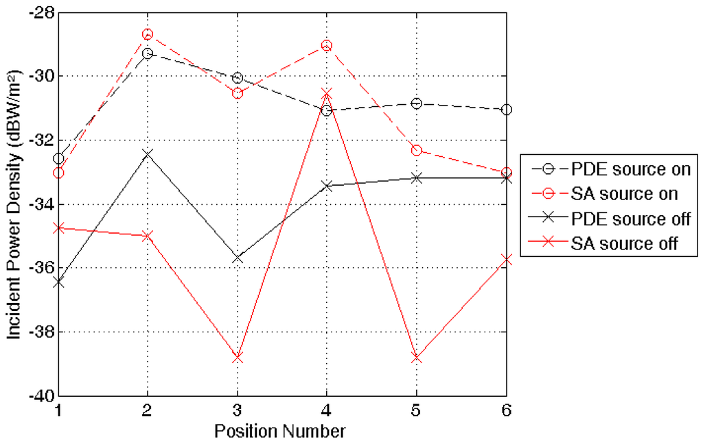 Validation measurements with a SA and an isotropic antenna in an indoor environment, see Figure 4, show a good correspondence with PDE measurements, with an average deviation of only 1.5 dB. This confirms the correct calibration of the measurement device. The correspondence between SA and PDE measurements is better in the “Indoor Pico-cell” scenario than in the “Outdoor Indoor” scenario. A larger deviation was to be expected for the “Outdoor-Indoor” signal, since both the uncertainty due to traffic on the channel and the temporal fading [35] are larger in this case, which increases the measurement uncertainty of both the PDE and the SA. Moreover, we have full control over the dominant exposure in case of the emitting pico cell, which increases reproducability. The best correspondence is obtained in the “Indoor Pico-cell” scenario on positions 1 to 3, which are located closest to the source. This was expected since closer to the source the exposure scenario corresponds best to our calibration measurements (specular multipath), whereas further away from the source diffuse components, which are currently not included in the calibration, migth become more important [36].