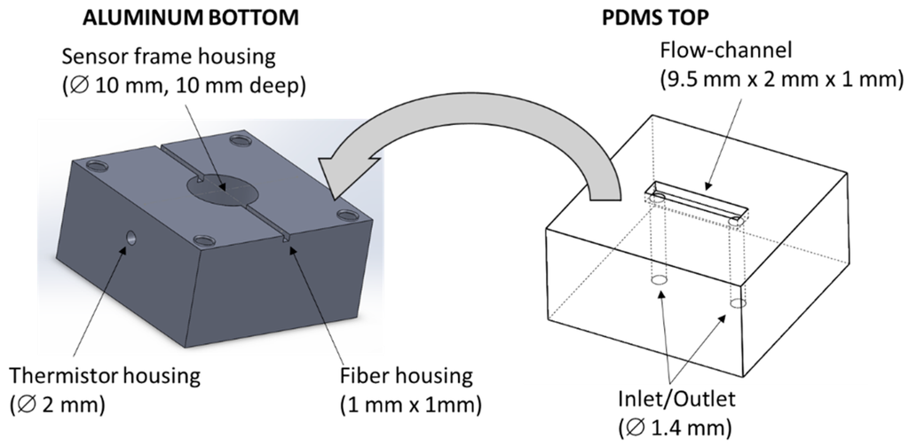 The dimensions of the bottom part are: 30 mm × 30 mm × 15 mm. (2) The PDMS top part with the flow-channel and the inlet and outlet. The dimensions of the flow channel are: 9.5 mm × 2 mm × 1 mm and the volume is about 20 µL. The total dimensions of the PDMS part are: 20 mm × 20 mm × 10 mm. The optical fiber sensor, mounted on its plastic frame (see Figure 1), fits perfectly into the sensor frame housing obtained into the aluminum bottom part so that, when the PDMS part is placed on the top, the flow-channel fits only in the area where the sensing region of the optical fiber.