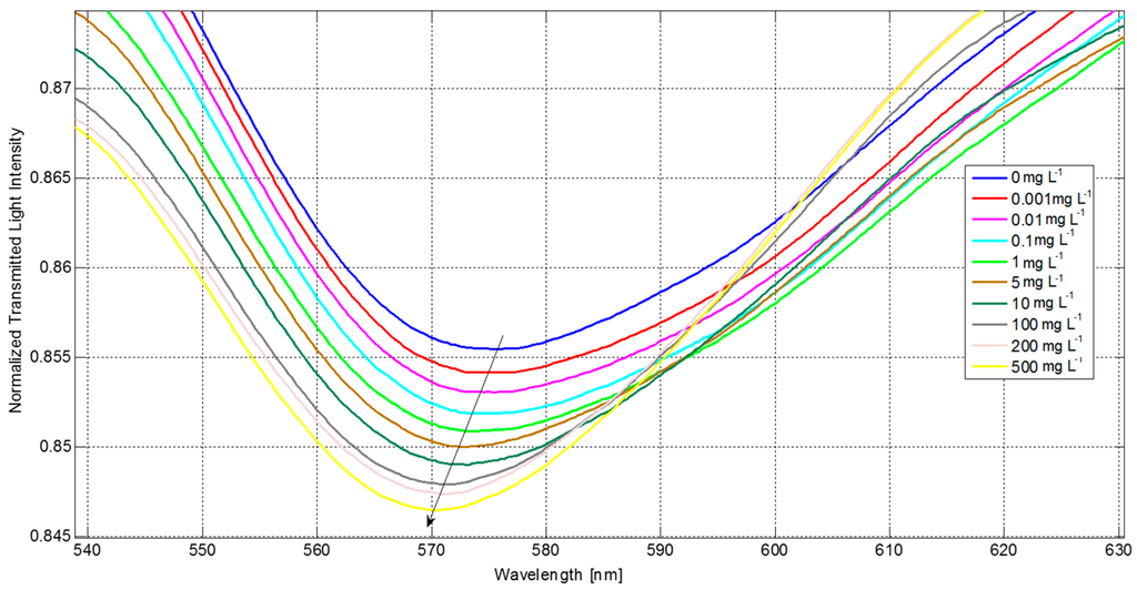 Figure 4 shows the shift of the SPR resonance at around 576 nm, obtained for different concentrations of the analyte (from 0 to 500 mg/L) in buffer solution: the resonance wavelength is shifted to lower values when the analyte concentration increases, indicating that the analyte effectively interacts with the immobilized receptors from the buffer matrix here considered. The increase in depth of the resonance peak exhibiting the blue-shift is a direct consequence of the stronger excitation of the surface plasmon, which depends on the effective RI of the layer.