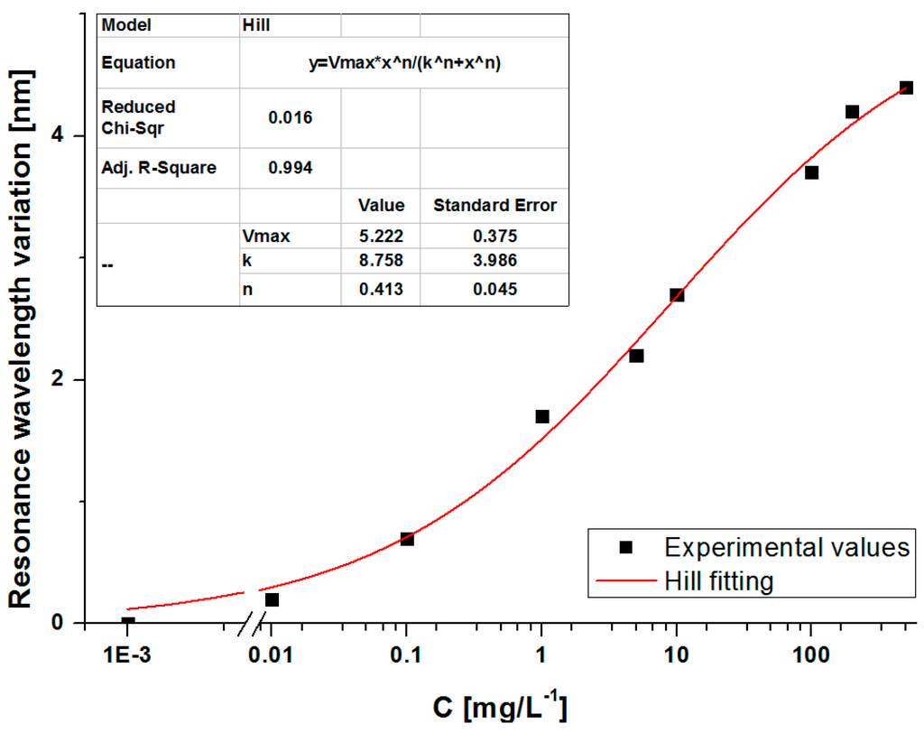 Since the parameter of interest is the measurement of the resonance wavelength shift, any changes in the resonance depth do not affect the results, as far as the peak remains clearly distinguishable. By extracting the minimum of the SPR resonance for each analyte concentration, it is possible to draw the calibration curve of the sensor. The absolute value of the wavelength shift of the transmission minimum (Δλ) versus the concentration of the analyte is shown in Figure 5, together with the Hill fitting of experimental values [18,25]. The results depicted in Figure 5, demonstrate that the system is able to detect concentrations of the analyte under investigation (IgG) lower than 0.01 mg/L.