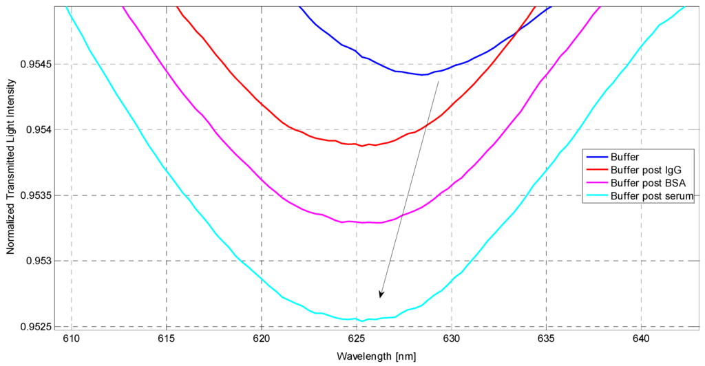 In this work, we have used a standard protocol to always measure the changes in refractive index due to the bio-interaction under the same conditions. In particular, a washing step with PBS (buffer) after the bio-interaction was carried out and the spectrum was recorded after stopping the flow thus with stable thermal and hydrodynamic conditions. Although the measurement under flow conditions could be used to exploit the biosensor interactions, it should be pointed out that the important measurand is constituted by the RI changes induced along the functionalized surface due to the specific interaction between the immobilized antibody and the antigen, and not by bulk RI changes, simply related to the refractive index of the solutions which are pumped inside the flow cell. This means that a washing step with PBS is necessary after each addition of the sample in order to measure the real shift of the resonance determined by the antibody/antigen interaction on the fiber surface.