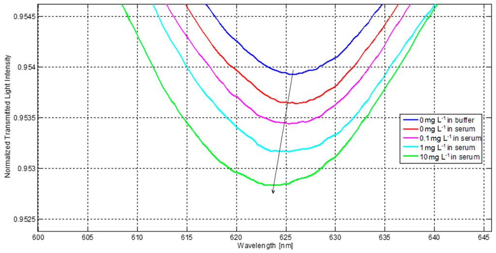 The total shift of the SPR resonance detailed in Figure 7 is roughly 2.2 nm, which is slightly lower than that obtained when the assay was performed in buffer for the same analyte concentration of 10 mg/L (2.7 nm from Figure 5). This could be ascribed to the higher complexity of the serum matrix with respect to simple PBS buffer, which implies a decrease of the antigen mobility [26].