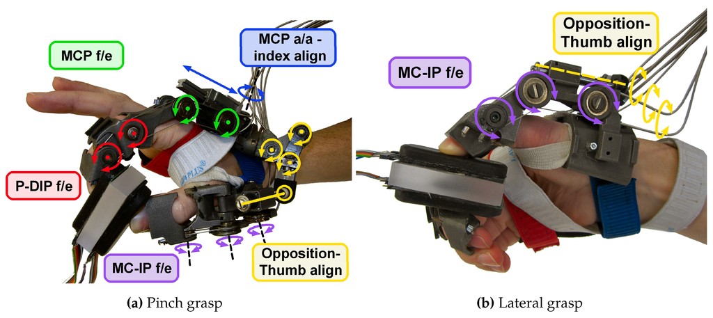 - Cempini, M.; Cortese, M.; Vitiello, N. A Powered Finger–Thumb Wearable Hand Exoskeleton With Self-Aligning Joint Axes. IEEE/ASME Trans. Mechatron. 2015, 20, 705–716. [Google Scholar] [CrossRef]