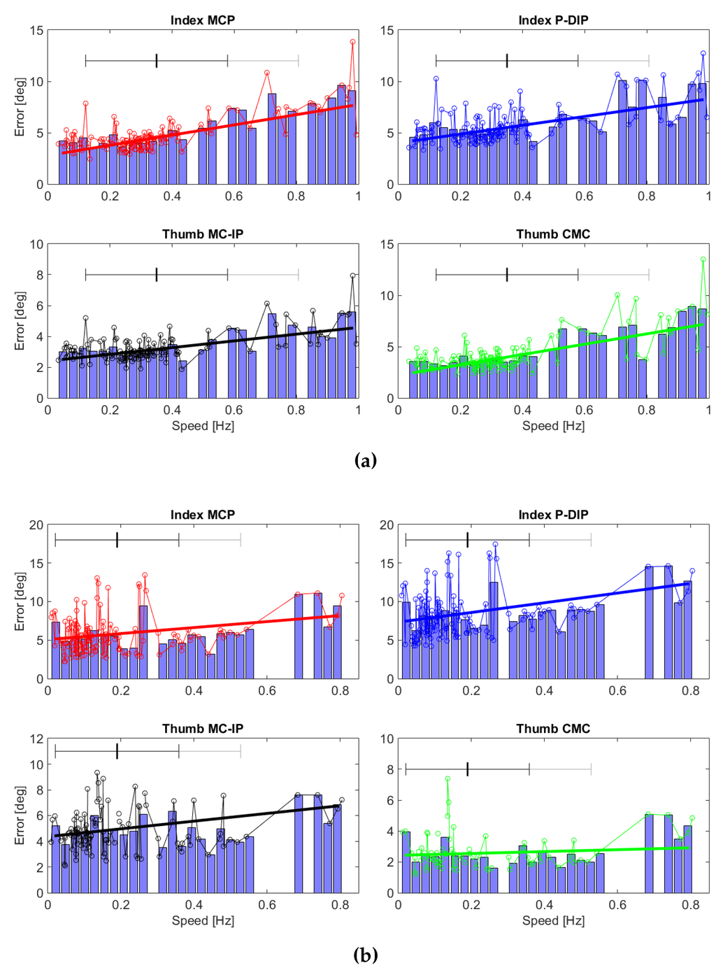 | Grasp Type and Speed | MCP (deg) | P-DIP (deg) | MC-IP (deg) | CMC (deg) | ||