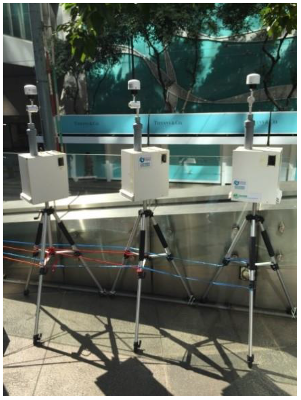 Prior to the deployment of systems in the Marathon, three identical sets of monitoring systems, mounted on tripods, were collocated with the roadside Air Quality Monitoring Station (AQMS) in Central, Hong Kong operated by the Hong Kong Environmental Protection Department [26], as shown in Figure 2. The station is located at the junction of Charter Road and Des Voeux Road with busy traffic. The PM2.5 inlets were 4.5 m above the ground. Field collocation tests were carried out from 16 January 2015 to 18 January 2015. During the test, the sensor systems were placed on the same platform at a distance of 1 to 2 m from the inlets of the AQMS. Closer proximity of the sensors to the AQMS inlets was possible and might improve the comparisons to some degree; however, ambient air monitoring siting practices call for case-specific separation of 1 or 2 m from regulatory-type PM2.5 monitors that run at 16.7 liters per minute. The setup used in this study was consistent with the accepted spacing practices, and the performance is further evaluated in the following section [27]. The sensor systems’ raw data were transmitted in real time to the cloud server located at City University at 5-s intervals. One-minute resolution AQMS data for PM2.5, NO2, CO and O3 were obtained from Hong Kong Environmental Protection Department (HKEPD).