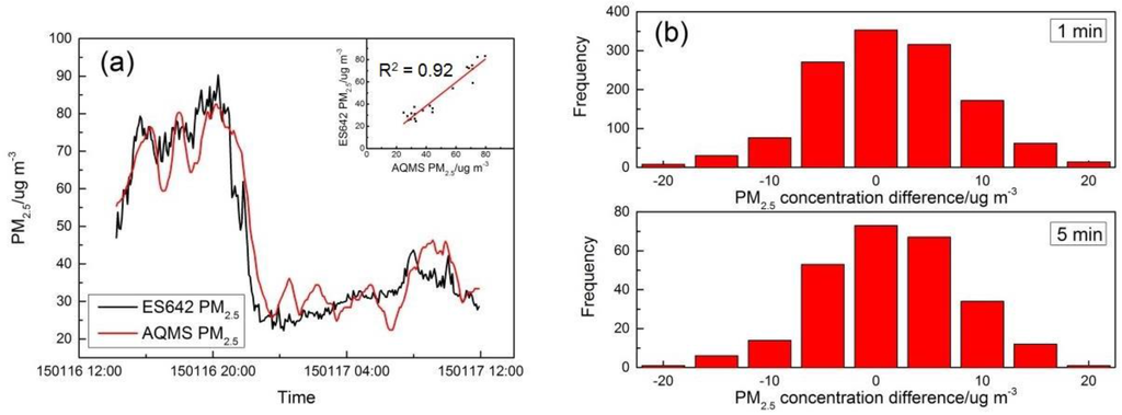 Comparison of the PM2.5 concentration from MAS and AQMS. (a) Time series of concentration; (b) histogram of the concentration difference in the 1-min and 5-min time average.