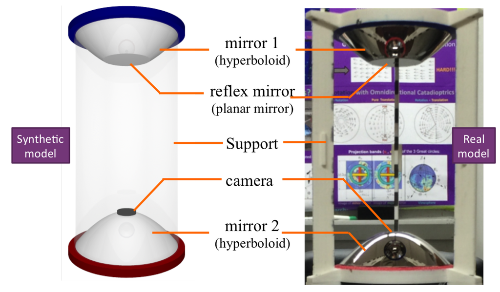 In reality, it is almost impossible to assemble a perfect imaging system that fulfills the SVP assumption and avoids the triangulation uncertainty studied in Section 5.3 on top of the error already introduced by any feature matching technique. The coaxial misalignment of the folded mirrors-camera system, defocus blur of the lens, and the inauspicious glare from the support tube are all practical caveats we need to overcome for better 3D sensing tasks. As described in the text for the real-life rig, we have avoided the traditional use of a support cylinder in order to workaround the cross-reflections and glare issues. Possible vibrations caused by the robot dynamics are reduced by vibration pads placed on the sensor-body interface. Details about our tentative calibration method for vertically-folded omnistereo systems has not been included in the current study since we would like the reader’s attention to be devoted to the sensor characteristics defended by this analysis.