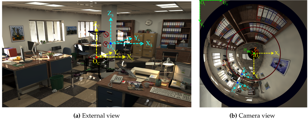 Photo-realistic synthetic scene: (a) Side-view of the quadrotor with the omnistereo rig in an office environment; (b) the image captured by the system’s camera using this pose.