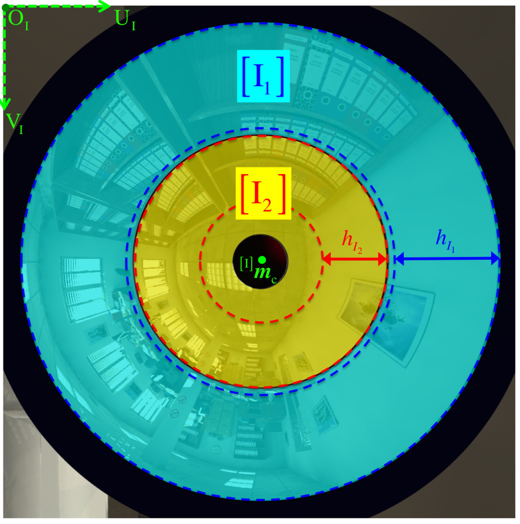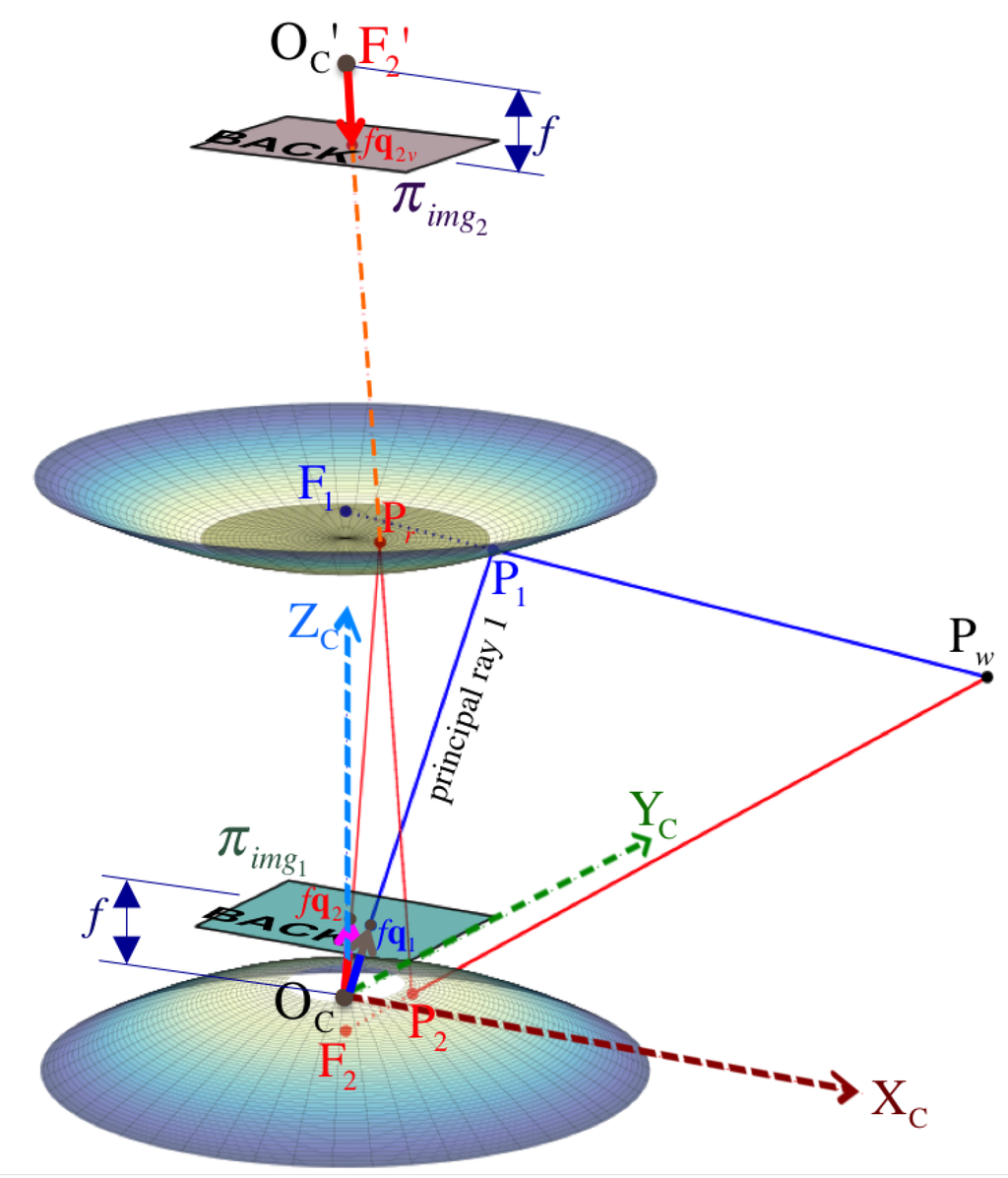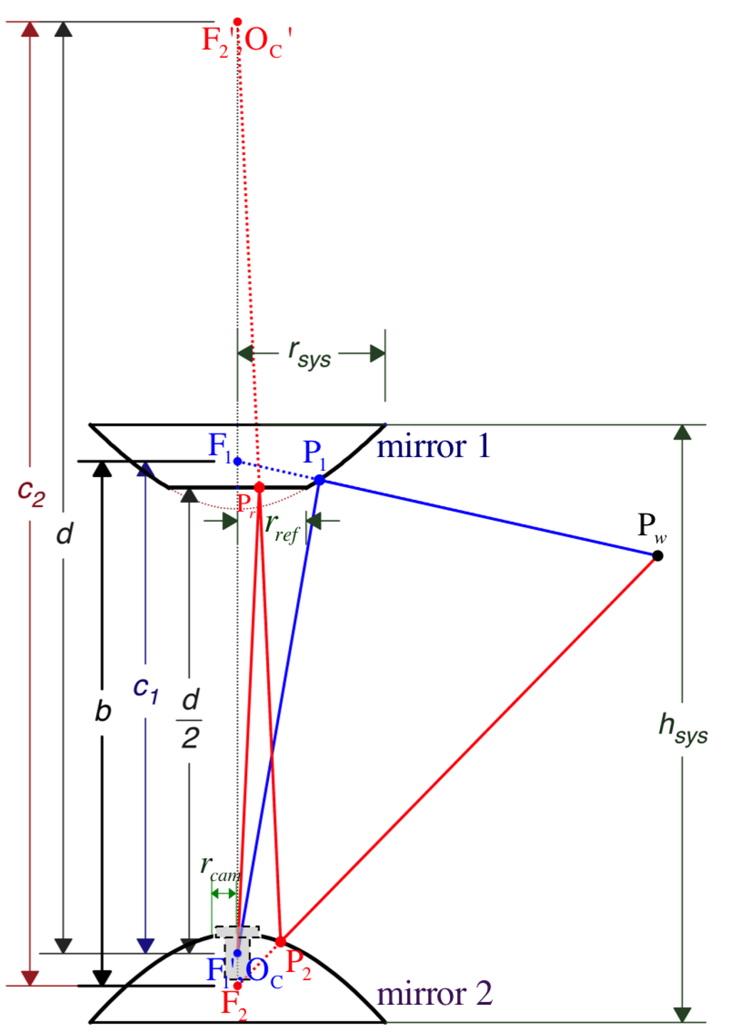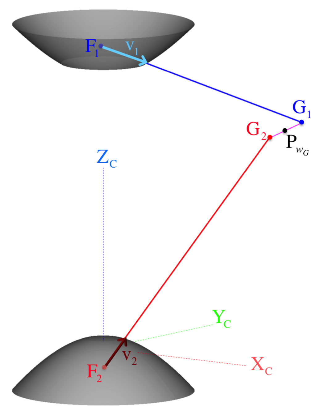 In our model, we describe both hyperboloidal mirrors, 1 and 2, with respect to the camera frame , which acts as the common origin of the coordinate system. Therefore,