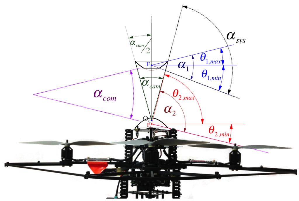 Vertical Field of View (vFOV) angles: and are the individual angles of the mirrors formed by their respective elevation limits ; is the overall vFOV angle of the system; and measures the overlapping region conceived between and .