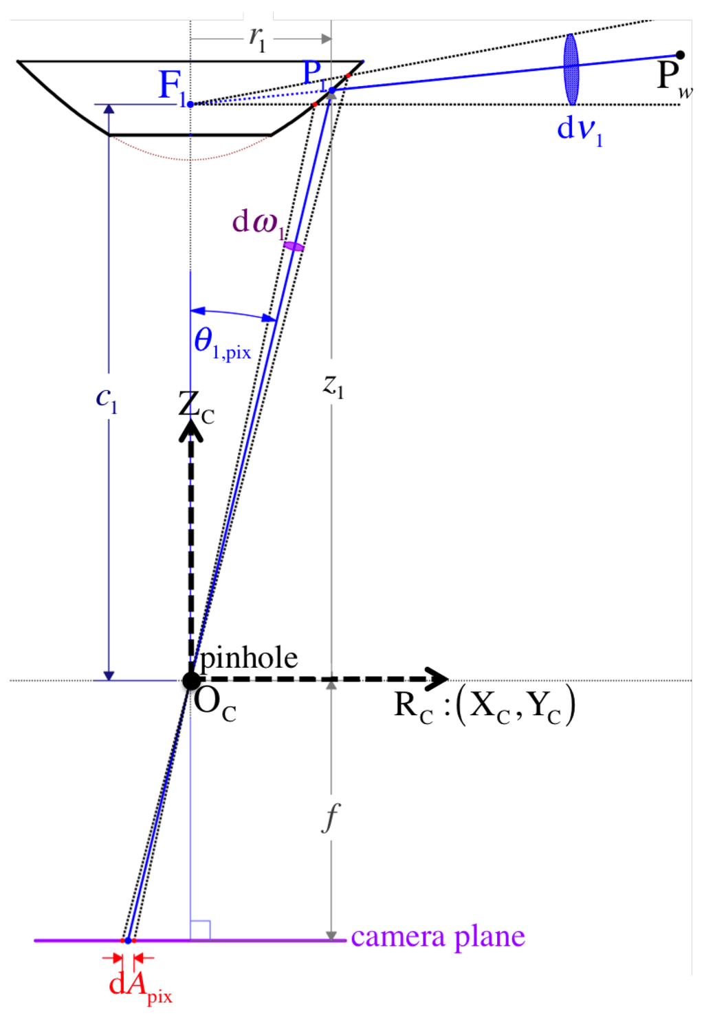 Finally, the reflection point with position can now be perspectively projected as a pixel point located at on the image. In fact, the entire imaging process of via mirror 1 can be expressed in homogeneous coordinates as: