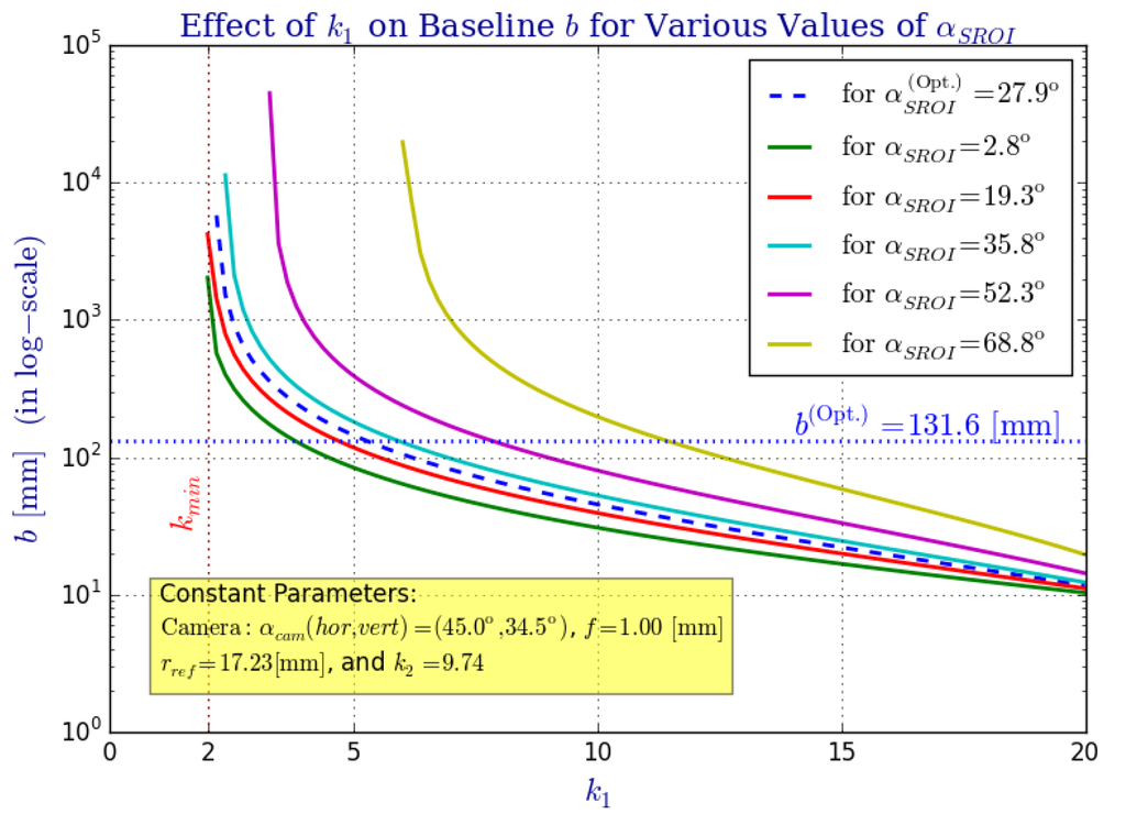 In Section 4, we perform a numerical optimization of the parameters in θ with the goal to maximize the baseline, b, required for life-size navigational stereopsis. At the same time, we restrict the overall size of the rig (Section 2.3) without sacrificing sensing performance characteristics such as vertical field of view, spatial resolution, and depth resolution. In the upcoming subsections, we first derive the analytical solutions for the forward projection problem in our coaxial stereo configuration as a whole. In Section 3.2, we derive the back-projection equations for lifting 2D image points into 3D space.