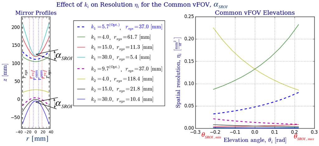 First, the height of the system, can be estimated from the functional relationships and defined in Equation (13), which can provide the respective component values at the out-most point on the mirror’s surface. More specifically, knowing , we get